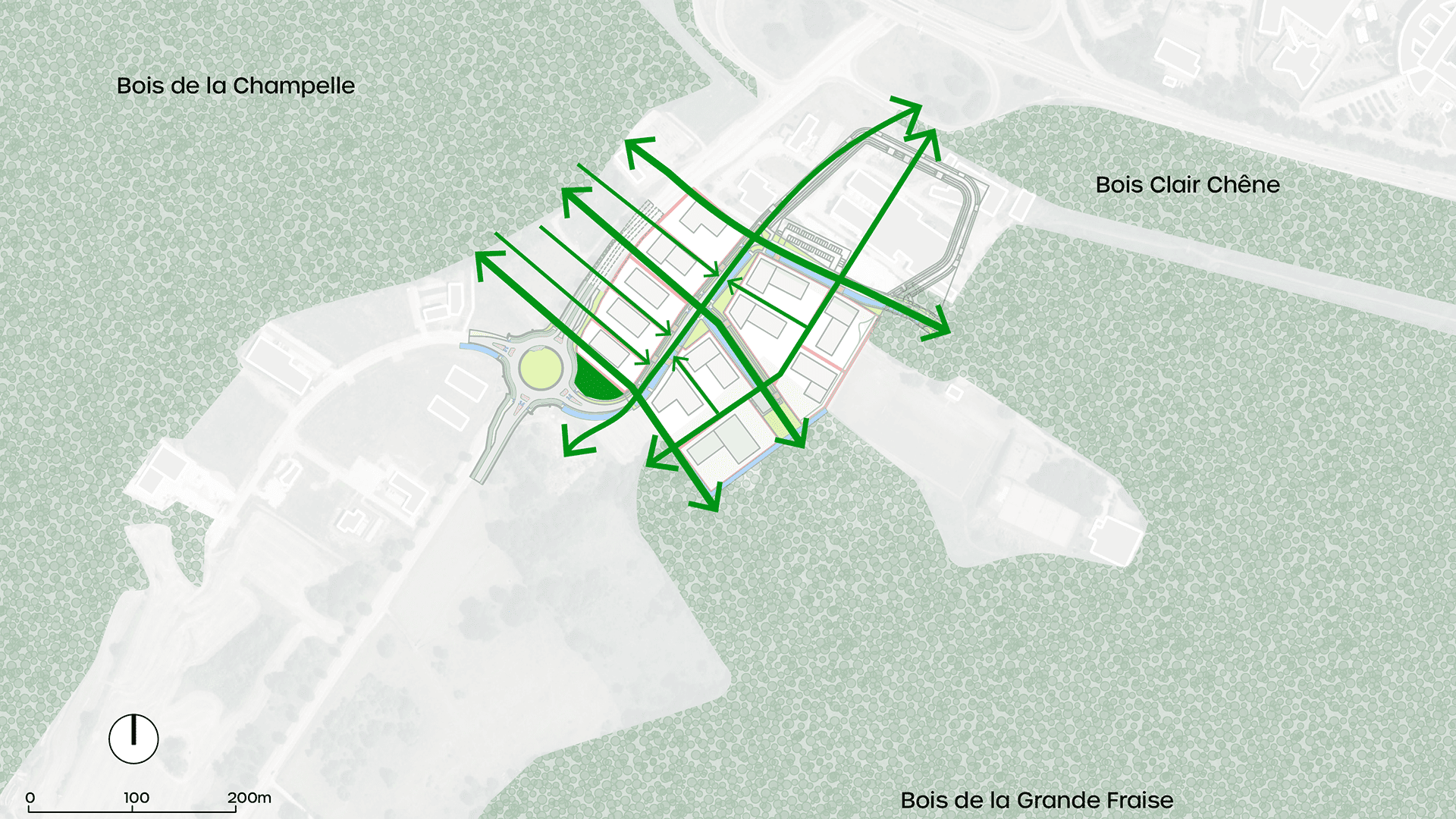 Sa conception s’appuie sur une intégration paysagère soignée, entre les bois de la Champelle, et les massifs forestiers du Claire Chêne et de la Grande Fraise. Ce contexte exceptionnel offre l’opportunité de penser la ZAE comme un maillon actif et cohérent d’un territoire vivant et productif.